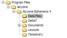 Alcyone Ephemeris can calculate ephemeris data of small bodies (dwarf planets, minor planets, comets). These calculations require special small body data files, which are provided by this page. Download a zip-archive and unzip all files in the data files folder (typically C:\Program Files\alcyone\Alcyone Ephemeris 4\Data Files - see tree stucture on the right). After a restart of Alcyone Ephemeris the respective bodies will appear in the Small bodies dialog.
