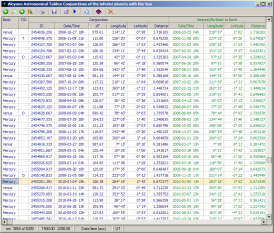 This table contains information on all inferior and superior conjunctions of Mercury and Venus with the Sun taking place from -2998 to 2999. For each conjunction the following data are given: