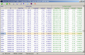 This table contains information on all aphelion and perihelion passages of Mercury, Venus, Earth, Mars, Jupiter, Saturn, Uranus, and Neptune taking place from -2998 to 2999. For each passage the following data are given: