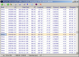 This table contains information on all greatest elongations (the maximum angular distance between the planet and the center of the Sun's disk) of Mercury and Venus taking place from -2998 to 2999. For each greatest elongation the following data are given: