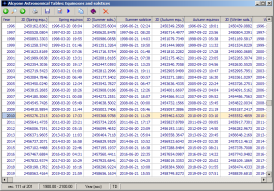 This table contains information on the times of equinoxes and solstices for the years -2998 to 2999. These are the instants when the apparent longitude of the sun (corrected for the effects of aberration and nutation) is 0° (spring equinox), 90° (summer solstice), 180° (autumn equinox), or 270° (winter solstice).